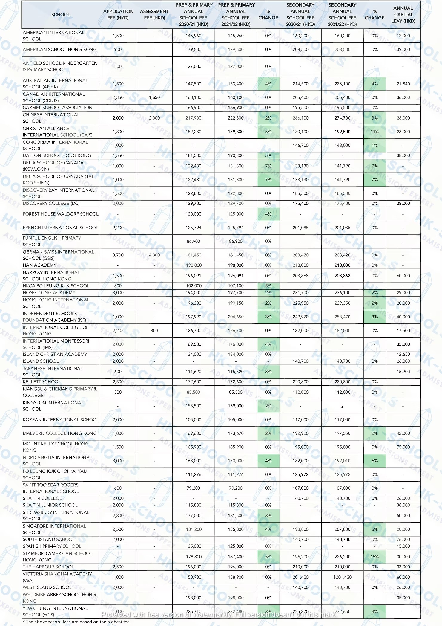 For Prep & Primary schools, Yew Chung International School has the highest tuition, charging more than HKD230,000 annually (based on the highest fee) with a 3% increase.