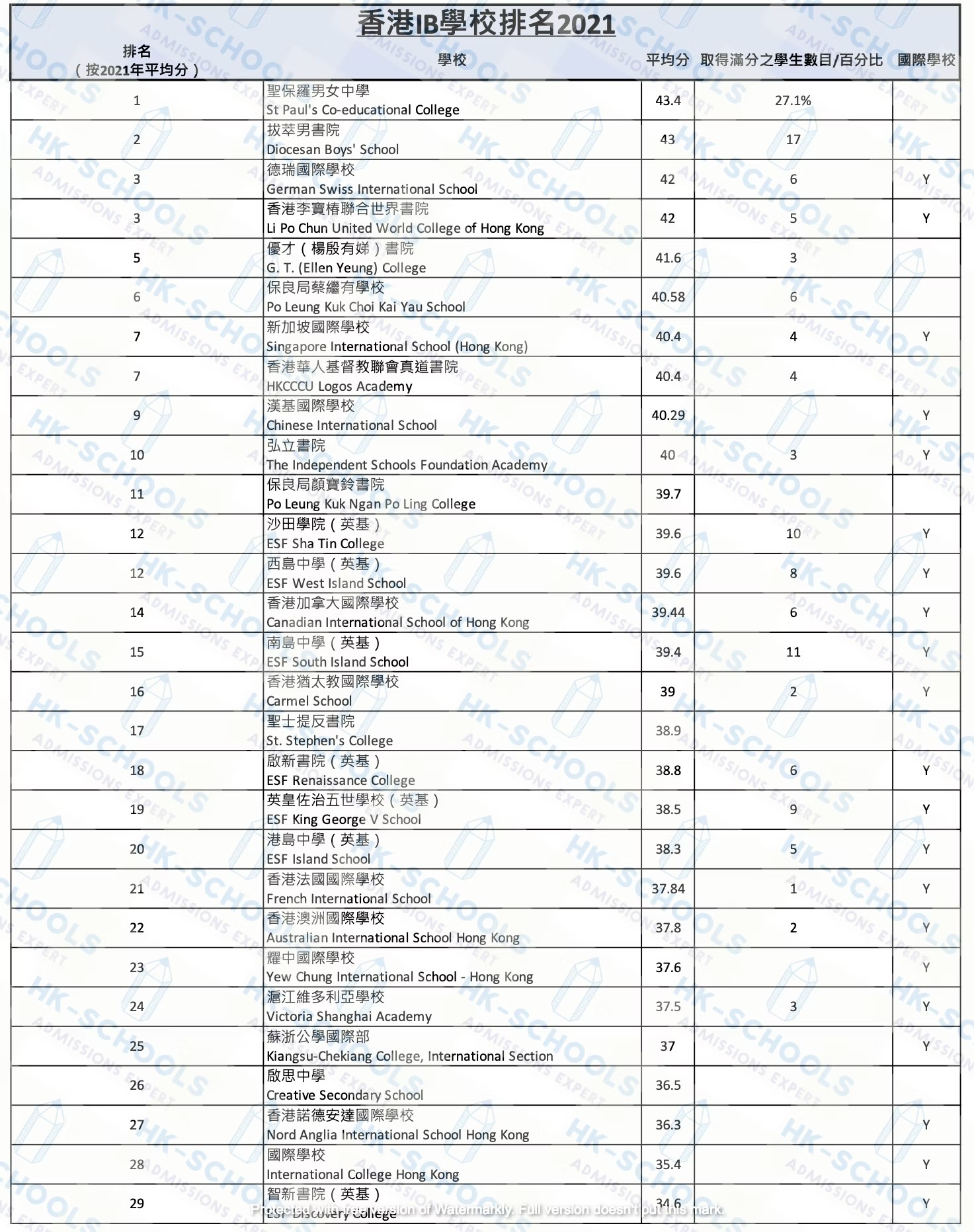 Hong Kong International Schools 2021 IB Rankings