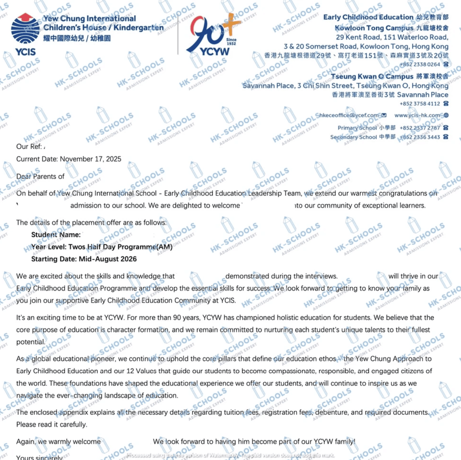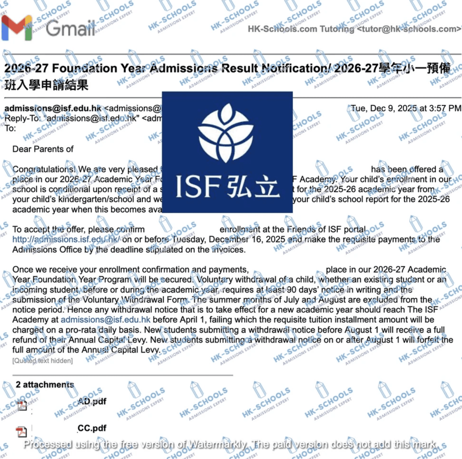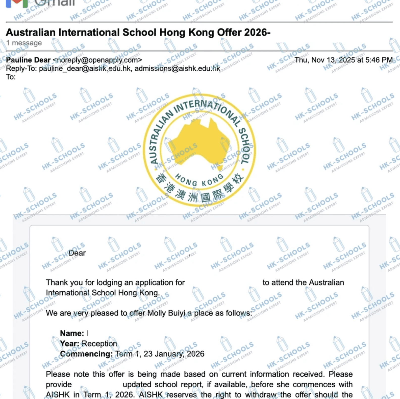 香港國際學校 - 預備班(2個錄取)、預備班2、一年級、三年級
